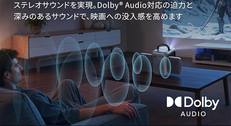ホームシアターというよりは「寝室シアター」専用機として推したい1台。 ジンバル内蔵で天井に映せるので、ベッドに寝転がって映画を観るというぜいたくが手に入ります。